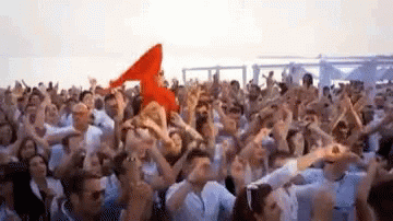 Cristiano Malgioglio dancing energetically in a large, festive crowd, holding a red flag and celebrating.