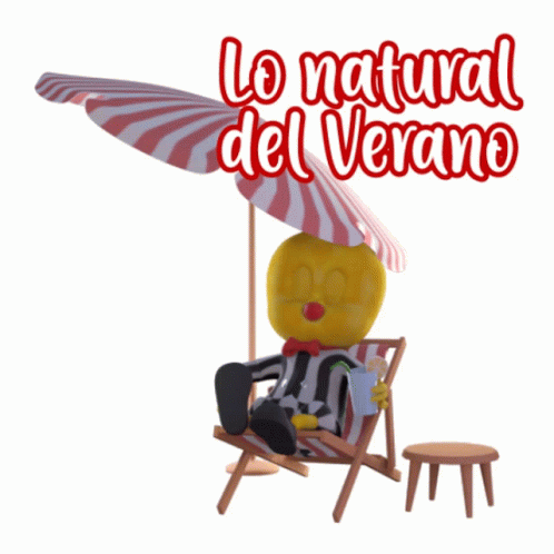 Pollito Malher, the cartoon character, relaxing in a beach chair under an umbrella, enjoying the natural side of summer.