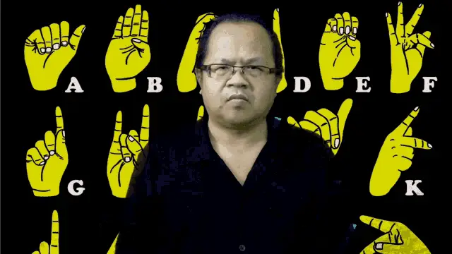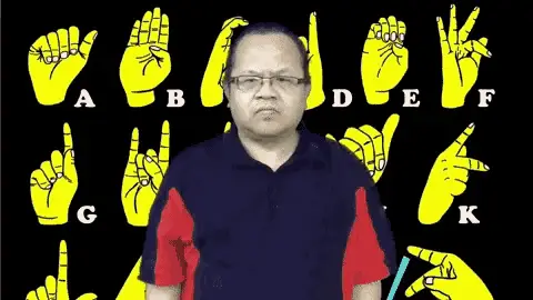 A man demonstrates the sign for 'Malheureux' (unfortunate) in French Sign Language (LSF) with alphabet signs in the background.