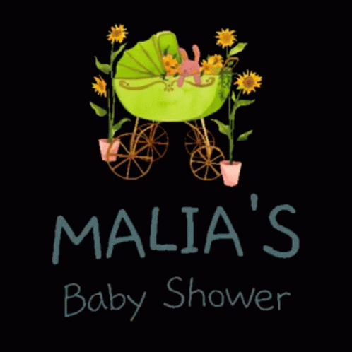 Malia's baby shower invitation featuring a charming green stroller adorned with sunflowers and a cute bunny.