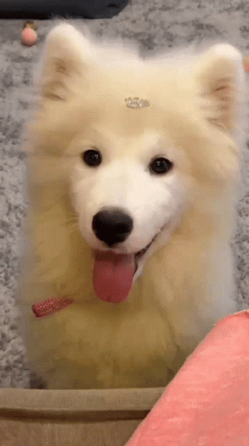Malu Viana's adorable white Samoyed puppy with a clip on its head, smiling at the camera with its tongue out.