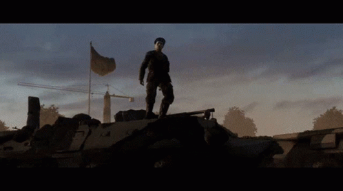 Lieutenant Malyshenko stands on a tank, salutes as jets fly overhead, with a Ukrainian flag in the background.