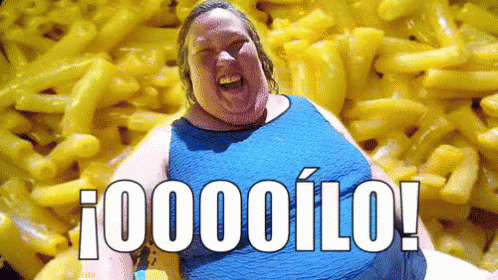 Mama De Honey Boo Boo (Mama June) laughing and exclaiming '¡OOOOÍLO!' in front of macaroni and cheese.