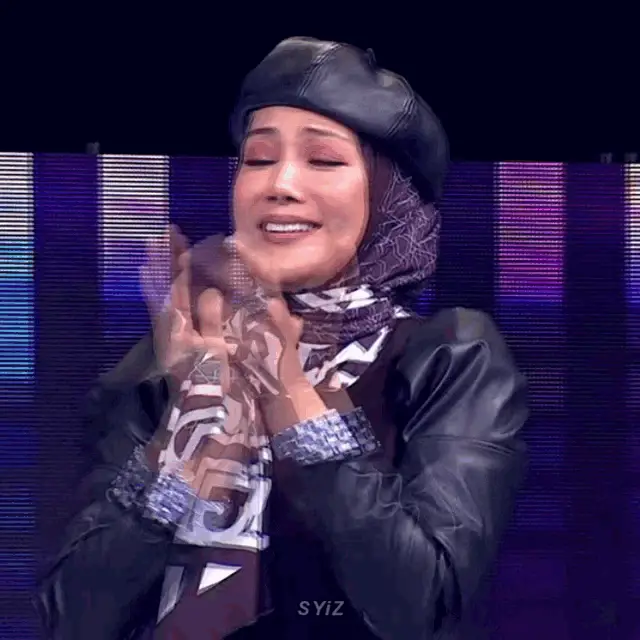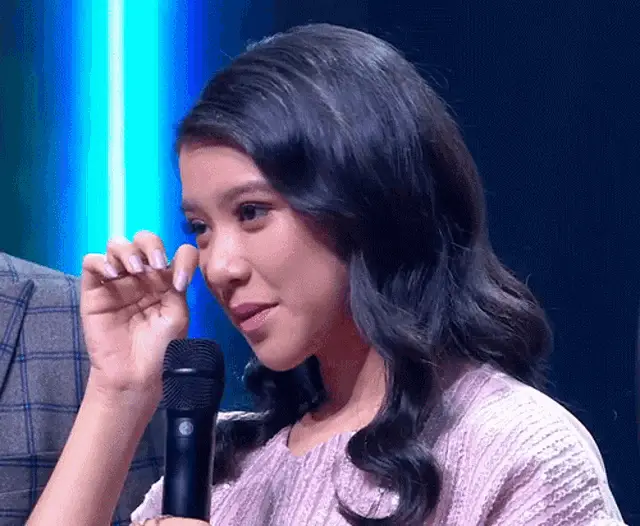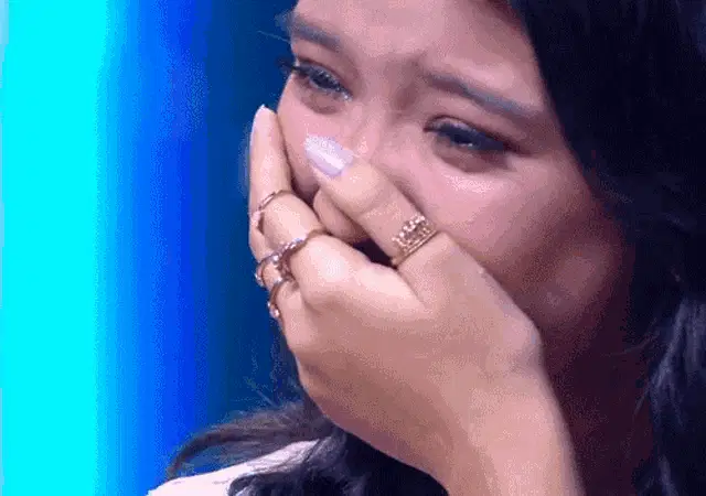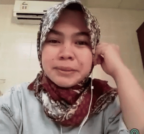A woman in a hijab and earphones becomes emotional, covering her nose with a tissue, as the text 'Mama Juga Kangen' appears.
