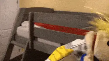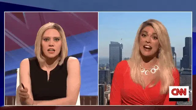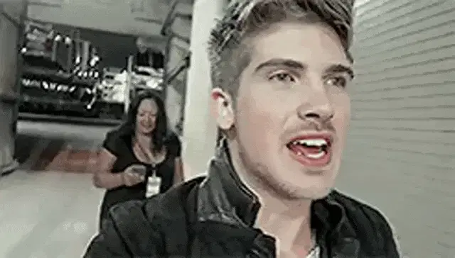 A bearded man in a cap gestures while singing "Mama Said Knock You Out" into a microphone on a colorful studio set.