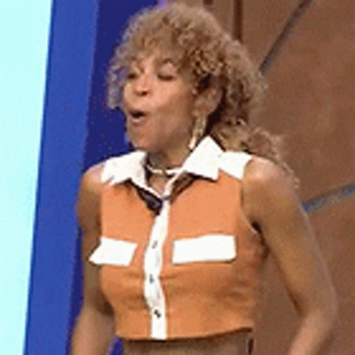 Karolconka, also known as Mamacita, shows an expressive moment with curly hair and a vibrant top.