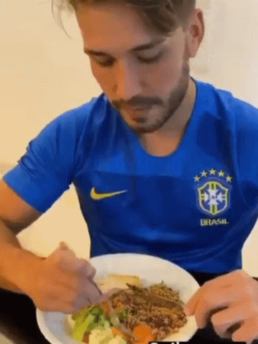 Lucas Bebezao, wearing a Brazil jersey, enjoys a meal of shredded meat and vegetables.