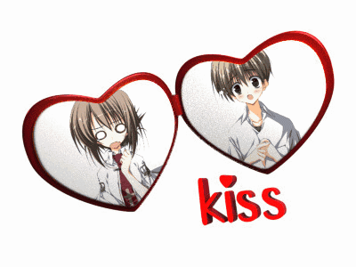 Mamiya Takuji and Tachibana Kimika in a cute heart-themed animation with the word 'kiss' displayed.