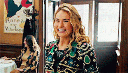 Lily James as Young Donna Sheridan from Mamma Mia Here We Go Again, smiling in a colorful jacket.