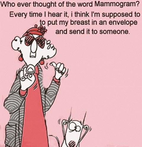 Funny cartoon about the word 'Mammogram' and a woman's humorous interpretation of it, featuring a woman and a dog.