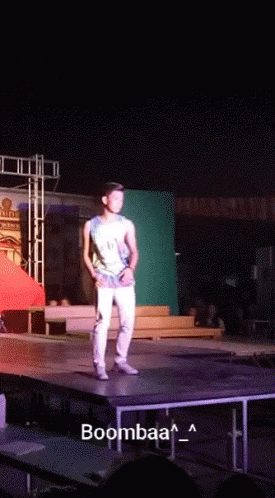An energetic man performs a dynamic dance routine on a brightly lit stage, with 'Boombah' displayed on screen.