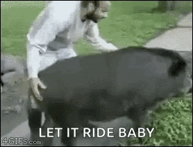 A man in a white outfit attempts to ride a large black pig, with the caption 'LET IT RIDE BABY' displayed.