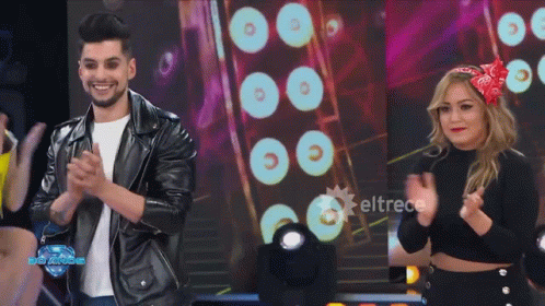 A man blows kisses and claps alongside a woman, both showing gratitude on the eltrece stage.