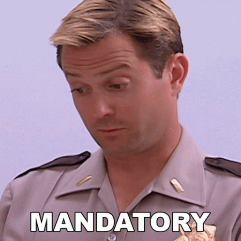 Lieutenant Jim Dangle from Reno 911! with the word 'Mandatory' overlaid on his uniform.