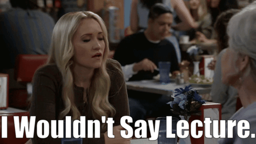 Mandy Mcallister and Emily Osment discuss a 'lecture' with the caption 'I Wouldn't Say Lecture'.