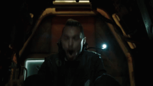 Maneo from The Expanse screams and headbangs wildly in a dark, confined space.