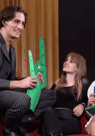 Måneskin members Damiano David and Victoria de Angelis laughing together, with Damiano holding a green foam finger.