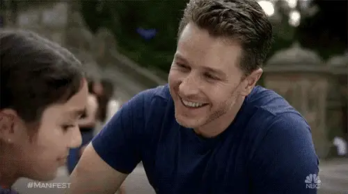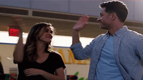Josh Dallas and Melissa Roxburgh share a high five, embodying their characters from Manifest.