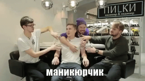 Men playfully prepare one man for a manicure at the PILKI salon, with a sign for 'manicure & pedicure' visible.
