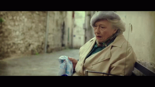 An elderly woman sits on a bench in a narrow street, holding a cloth and speaking animatedly.