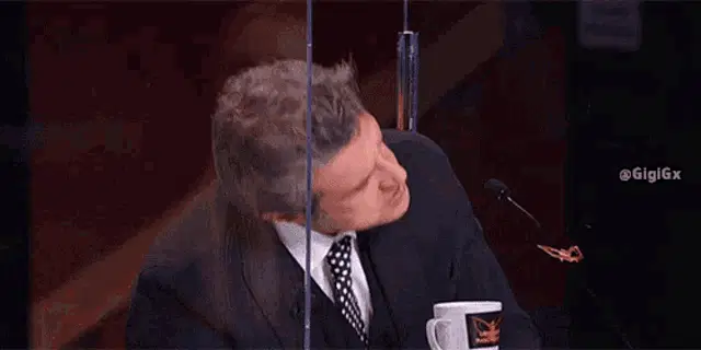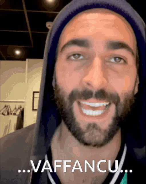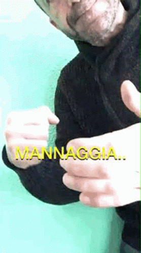 Man in black sweater expresses frustration with 'Mannaggia' text on screen, giving a thumbs up.