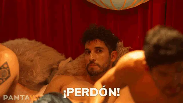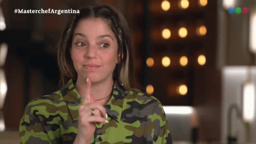 Juariu makes a funny face and 'hands up' gesture on Masterchef Argentina.