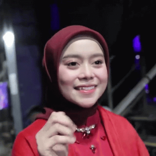 Lesti, wearing a red hijab and jacket, smiles and gives a thumbs-up gesture.
