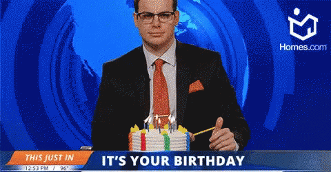 News anchor lights candles on a birthday cake with 'It's Your Birthday' banner.