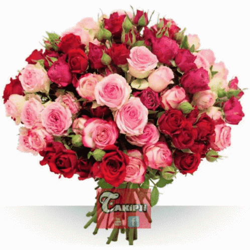 A stunning, vibrant bouquet featuring numerous pink and red roses, with a 'Takipji' branding sign.