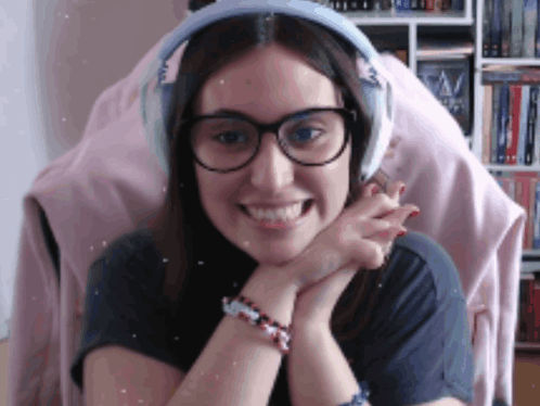 Feeh Sarzano, wearing glasses and headphones, smiles brightly with her hands clasped under her chin.