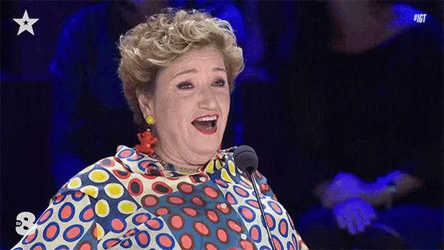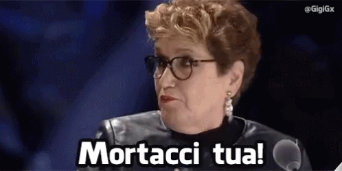 Mara Maionchi, wearing glasses, passionately exclaims 'Mortacci tua!' into a microphone.