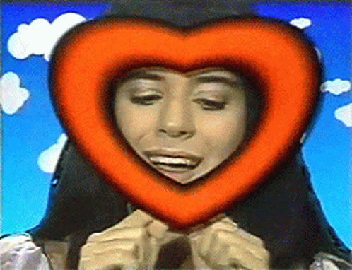 Mara Maravilha blows a flying kiss, surrounded by animated hearts, in a vibrant, retro TV clip.