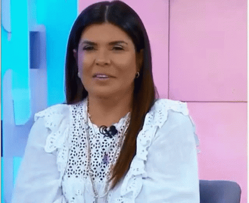 Mara Maravilha speaks passionately, gesturing while wearing a white lace top and microphone on a TV set.