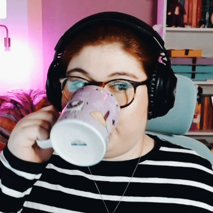 a woman wearing headphones and glasses is drinking from a mug that says ' ice cream ' on it