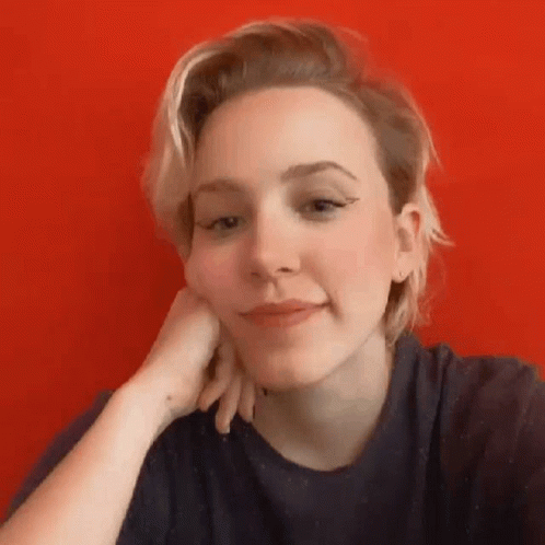 Marcella Rica makes playful faces and winks at the camera, resting her hand on her chin against a red background.