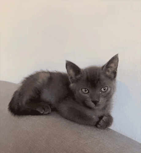 Marcelo Gato, a cute gray kitten, is seen resting comfortably on a couch, looking directly at the camera.
