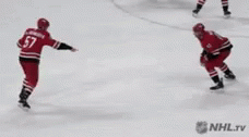 Hockey players combine sports, dribbling a football and making a basketball dunk on the ice during a March Madness celebration.