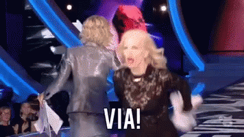 Marchesa Daragona energetically shouts 'VIA!' on a brightly lit stage, gesturing with her hands.