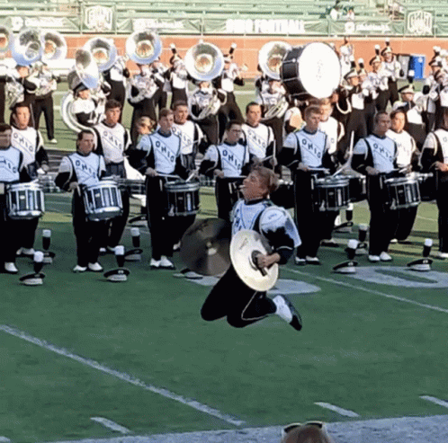 An energetic cymbal player from the Ohio University Marching 110 band performs a dynamic jump and spin on the field.