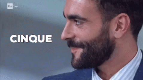 Italian singer Marco Mengoni in a suit, smiling and speaking, with 'CINQUE' displayed on screen.