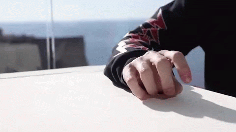 Marco Mengoni's hand on a table, showing signs of nervousness with the ocean in the background.