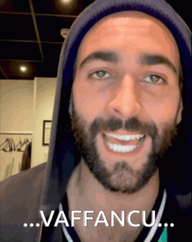 Marco Mengoni playfully says 'Vaffancu' while wearing a hooded jacket and smiling.
