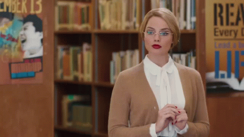 Margot Robbie portrays a librarian, wearing glasses, a white blouse, and a brown cardigan in a library setting.