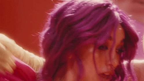 Maria Becerra with vibrant purple hair, performing her song 'Payaso' in a colorful setting.