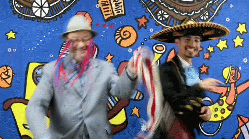 Leonardo Dantés and another man in Mariachi attire dance energetically in front of a vibrant mural.