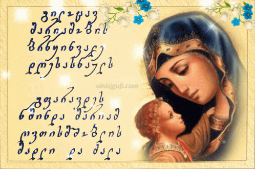A religious image depicting the Virgin Mary and baby Jesus, accompanied by Georgian text celebrating Mariamoba.