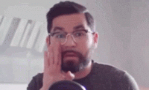 Marico, a man with a beard and glasses, makes a shocked expression while cupping his hand to his mouth as if whispering.