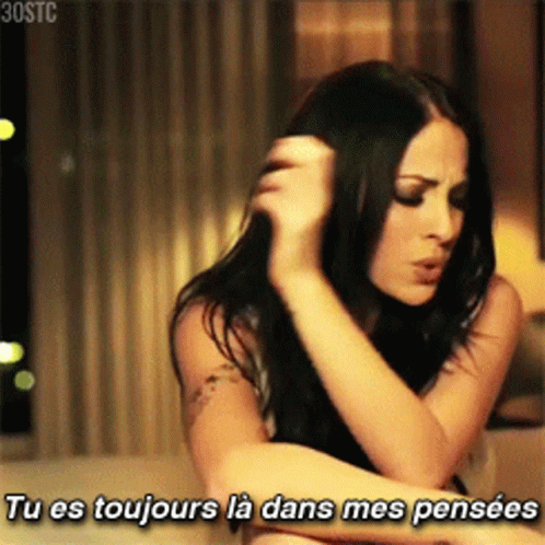 Marie Mai reflecting with the words 'Tu es toujours là dans mes pensées' on screen.