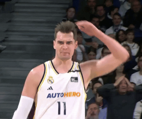 Mario Hezonja, wearing his Real Madrid jersey number 11, shows an intense emotional reaction during a basketball game.