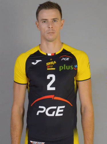 Mariusz Wlazly Wlazły, a volleyball player, stands in his PGE Skra Bełchatów black and yellow jersey with number 2.